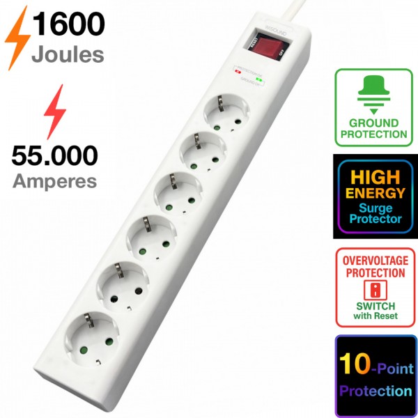 Surge Protector with 1600Joules, 6-sockets and Reset Switch