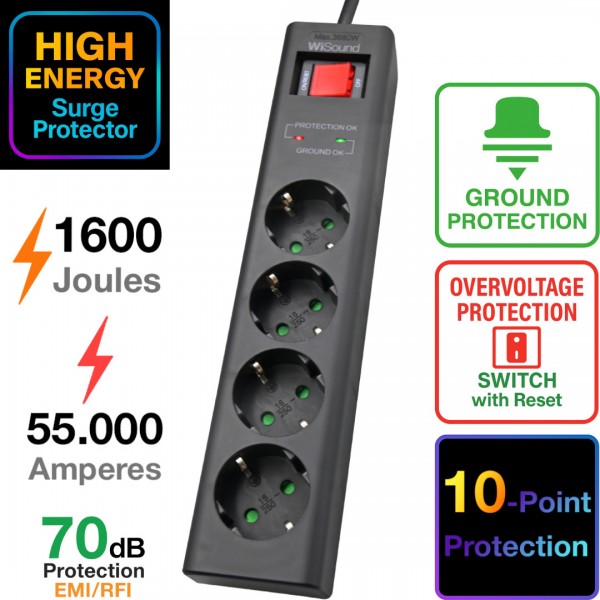 Eliminate electromagnetic interference. The sensitive circuitry of your electronic equipment needs to be protected against electromagnetic noise and electric current “impurities”. All our surge protectors come with an impressive 70dB integrated filter.